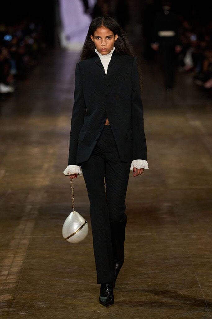 The actress wore a McQueen Fall 2025 suit featuring a curved-front, tailored jacket cut from exaggerated cavalry twill wool. The structure is wonderfully sharp, but it’s the ivory shirt underneath — with its Chantilly lace collar and cuffs — that quietly shifts the entire energy of the look. Suddenly, you’re not just seeing a smart suit; you’re getting a whisper of Victoriana, a touch of romance, and a hint of nostalgia for an era when garments told entire stories through their details.